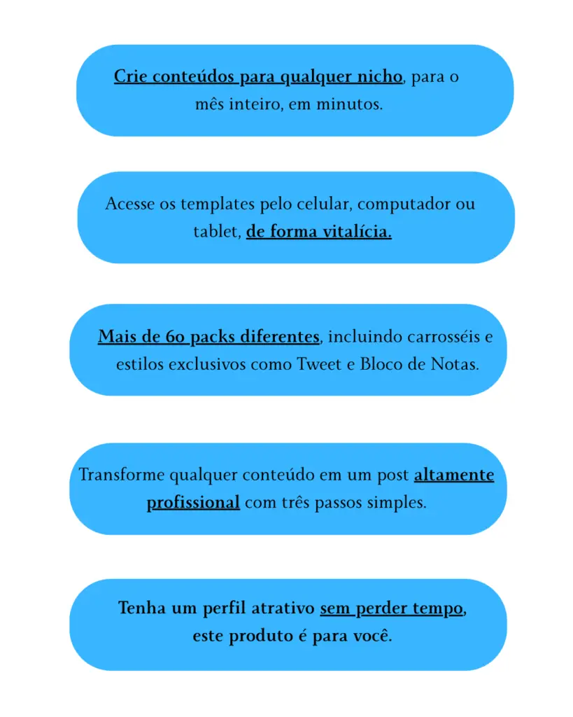 Você receberá acesso a uma plataforma recheada de conteúdos, tutoriais e os melhores modelos de posts para você usar de forma vitalícia.